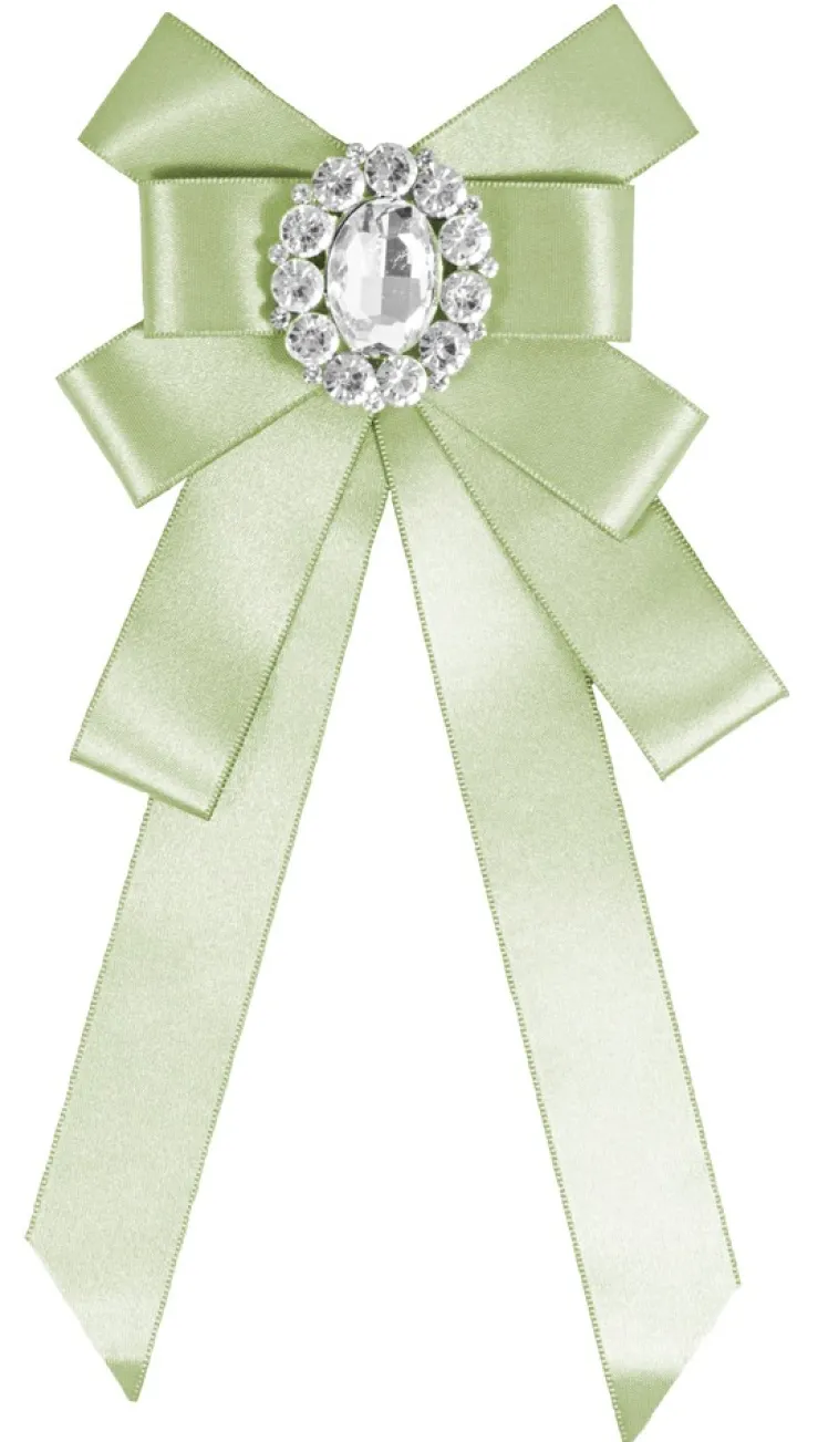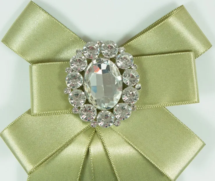 Glänzend wird die Schleifenbrosche nicht nur durch den Stoff, sondern besonders durch die Verzierung mit den Strass Steinen.