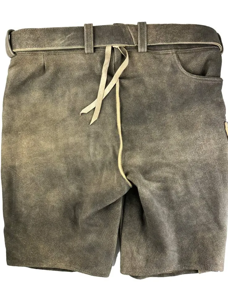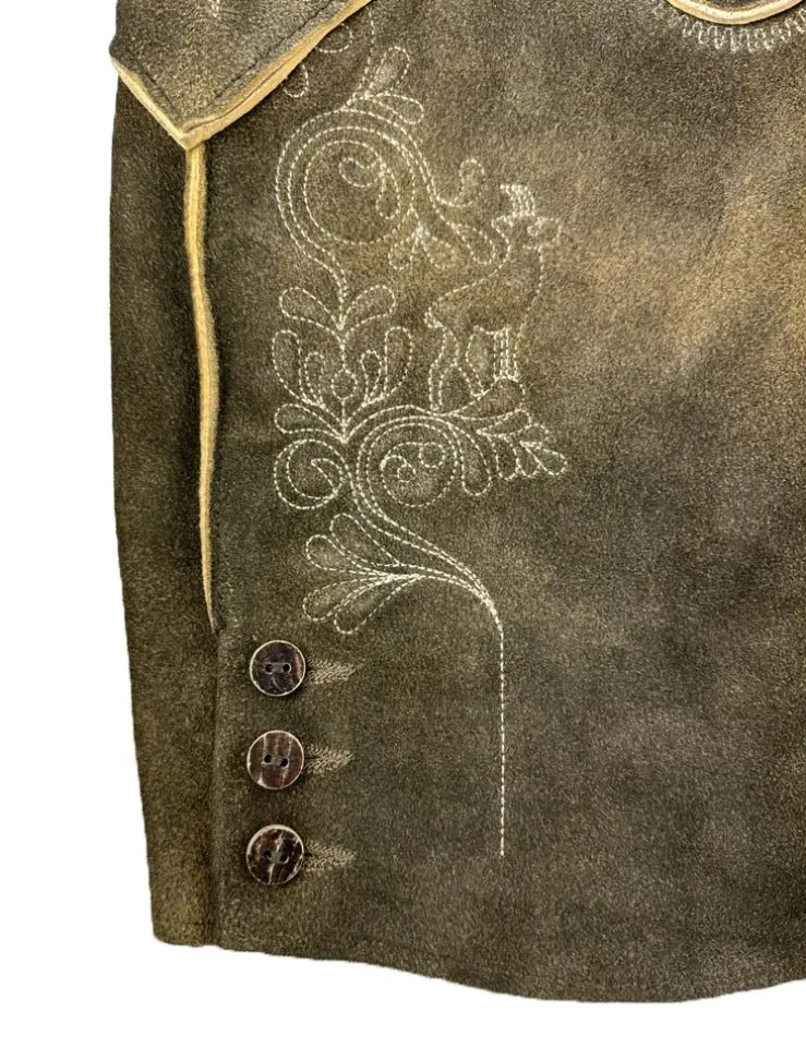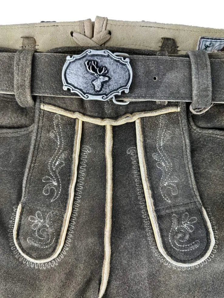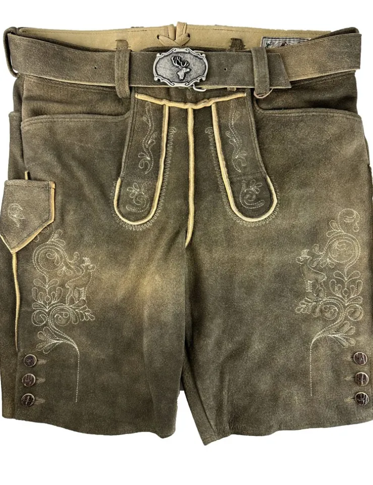 Unsere kurze Lederhose Schorsch 1 ist aus weichem Ziegenvelours hergestellt und schön weich im Griff. Sie wird mit einem tollen Ledergürtel mit Hirsch-Zierschnalle geliefert und liegt voll im Trend. Neben schönen Stickereien seitlich am Bein und am Hosenlatz runden echte Hirschhorn-Knöpfe die Lederhose perfekt ab. Der Hosenlatz wird vorn durch passende Knöpfe geschlossen und die Bundweite kann hinten durch ein Lederband reguliert werden. Neben den zwei Eingriffstaschen besitzt diese Lederhose auch noch eine kleine bestickte Tasche am rechten Hosenbein. Diese braune Lederhose besticht durch die raffinierte Verbindung von eleganten und derb-rustikalen Lederapplikationen.