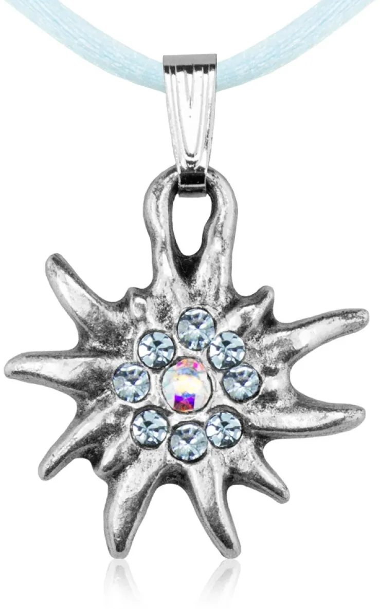 Ein schöner Edelweiß-Anhänger hängt an einem einreihigen, farbigen Band. Das Edelweiß ist mit Swarovski Strass besetzt und funkelt sehr schön.