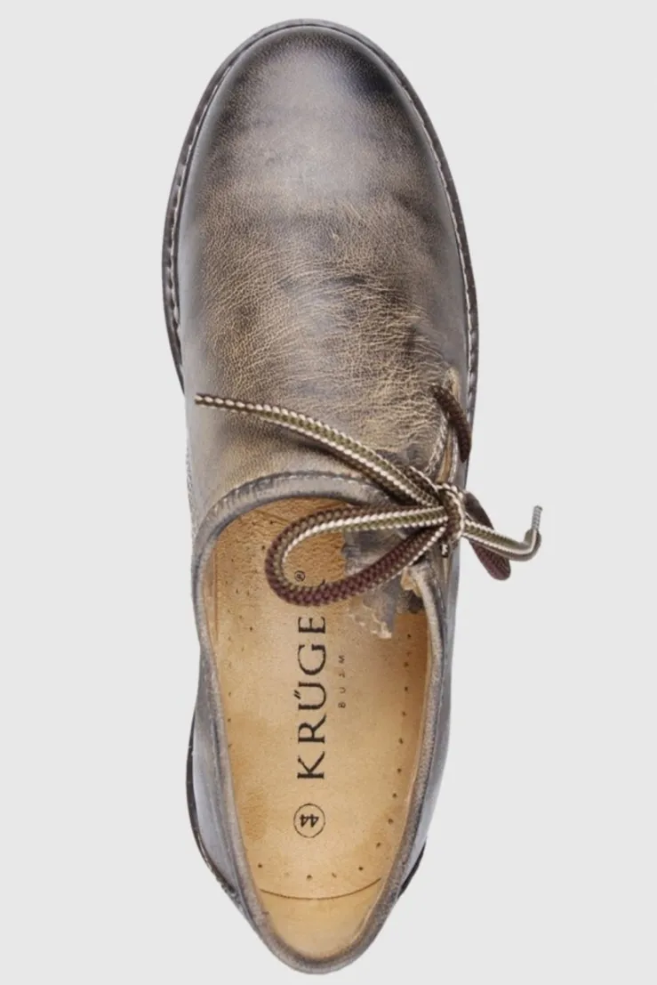 Der rustikal verarbeitete Herrenschuh mit der traditionellen Seitenschnürung ist ein echter Hingucker. Der Marken Schuh aus dem Hause Krüger ist vielseitig kombinierbar zur Lederhose oder Jeans. Hochwertige Qualität und Verarbeitung zeichnen diesen Trachtenschuh aus.