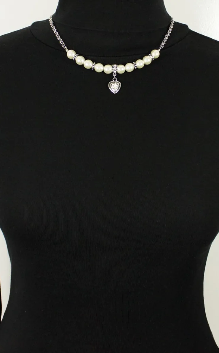 Die silbernen Erbskettenbänder sind im vorderen Bereich mit cremig weißen Perlen besetzt, die von silbernen Zierelementen unterbrochen werden.
