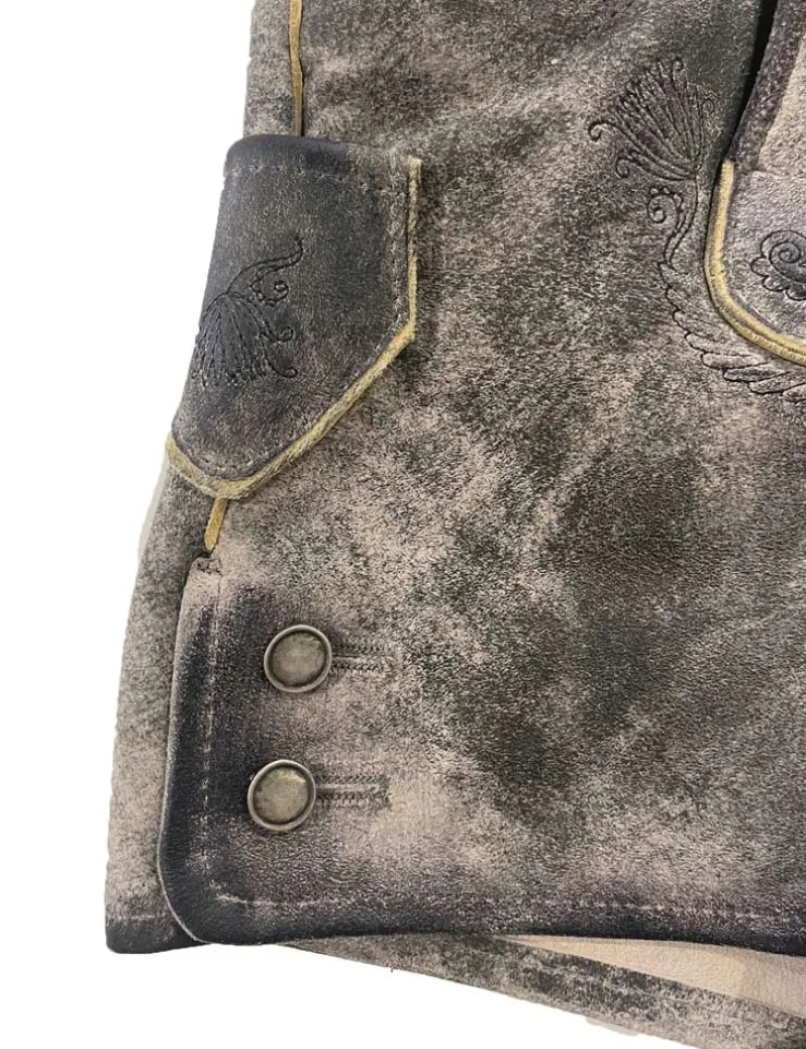 Die kurze Lederhose aus Leder ist besonders hochwertig verarbeitet. Schöne Stickereien und ein passender Gürtel machen diese Hose zu einem echten Hingucker. Die Hose wird vorn durch Knöpfe in Hirschhorn Optik geschlossen, die Bundweite kann hinten durch ein Lederband reguliert werden. Die Lederhose hat vorne zwei Hosentaschen und ist zusätzlich noch mit einer Hosentasche hinten und einer kleinen Seitentasche versehen. Ergänzen Sie unsere Trachtenhose vom deutschen Hersteller Maddox noch mit einer Trachtenbluse oder einem Shirt und perfekt ist das stylische Trachten Outfit Mädchen.