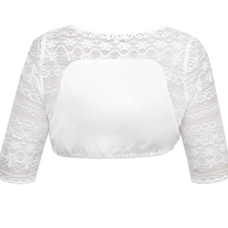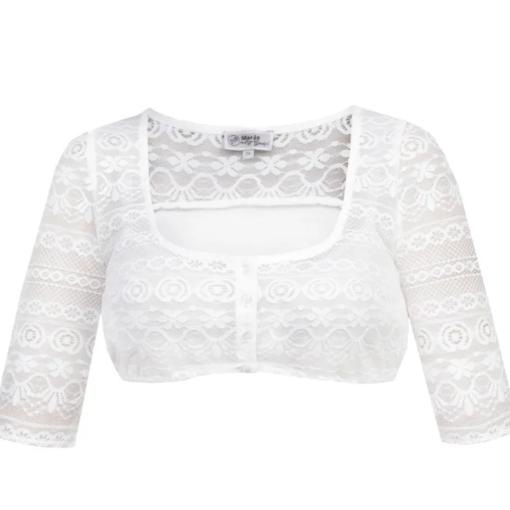 Romantische, exklusive Dirndlbluse für Damen von MarJo Trachten. Die hinreißende Dirndlbluse Ganina-Candia ist aus Spitzenmaterial in Stretch-Qualität hergestellt, sie hat einen schönen eckigen Ausschnitt und halblange Ärmel. Die Bluse wird vorn mit einer Knopfleiste geschlossen und das besondere Spitzenmuster ist perfekt als Ergänzung zu vielen Miedern und Dirndln.