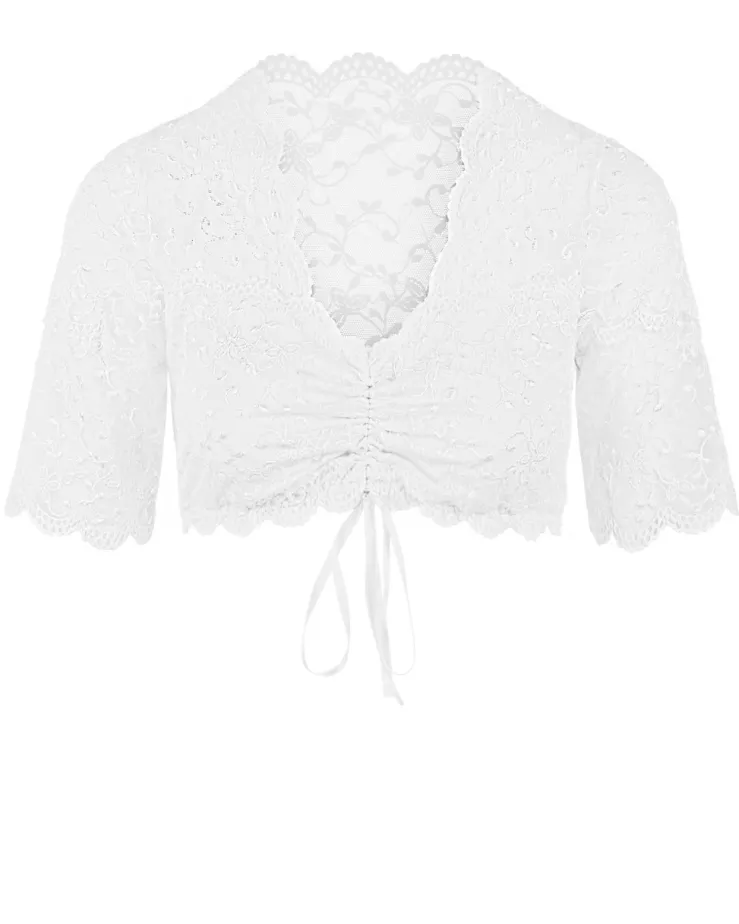 Die Damenbluse ist komplett mit floraler Spitze verziert, wobei die halblangen Ärmel und die Schultern aus halbtransparentem Material bestehen. Der Brustbereich ist mit weichem, blickdichten Stoff unterlegt und mit der Raffung können Sie selbst die Tiefe Ihres Ausschnitts bestimmen. Der eingearbeitete Gummizug am Blusenabschluss verleiht der Trachtenbluse einen perfekten Sitz und eine gute Passform.