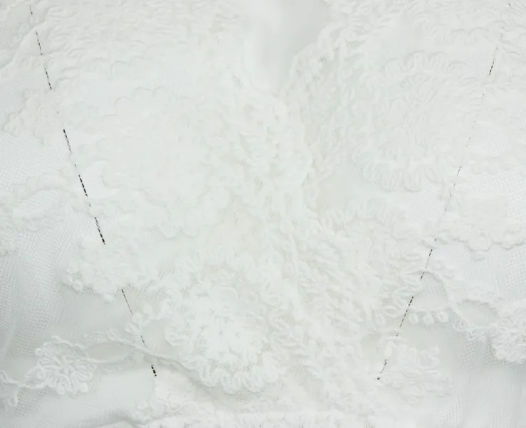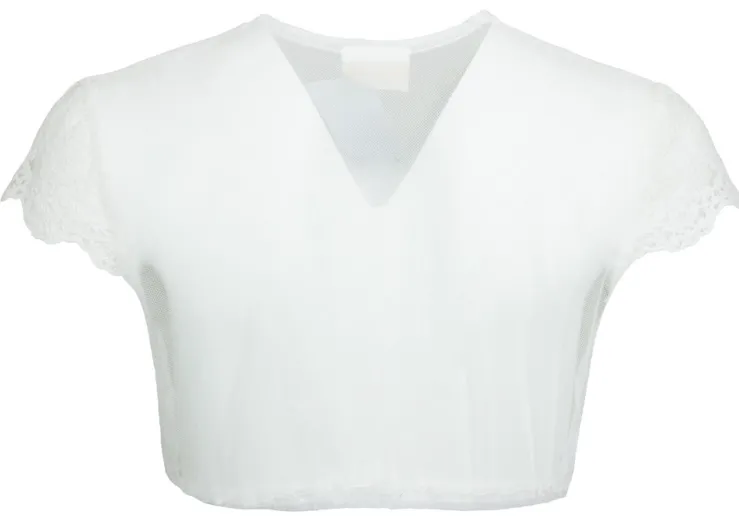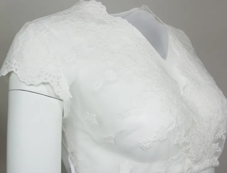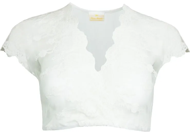 Die hochwertige Bluse für Damen ist komplett aus halbtransparenter Spitze gearbeitet und mit wunderschöner floraler Stickerei verziert. Sowohl der Ausschnitt, wie auch die angeschnittenen Ärmel haben eine zauberhafte Bogenkante. Da die Bluse einer Wickelbluse ähnlich gearbeitet ist, wird sie ohne Knöpfe geschlossen und der Gummibund sorgt für den perfekten Sitz. Die Dirndlbluse ist aus einem Baumwollmischgewebe und dadurch wunderbar pflegeleicht, formstabil und knitterarm.
