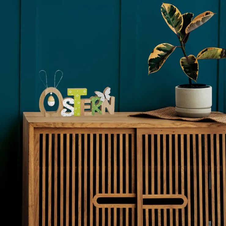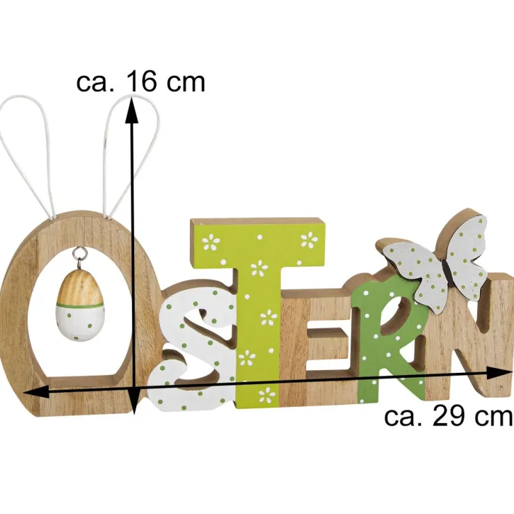 Die bezaubernde Osterdeko ist als Schriftzug mit dem Wort Ostern designt. Frühlingshafte Elemente, wie der Schmetterling, das Blümchendesign, sowie die frischen Farben, kombiniert mit dem natürlichen Look machen die Dekoration zum süßen Hingucker. Die lustigen Hasenohren, sowie das Osterei im O geben dem Dekoaufsteller einen frechen Pepp.