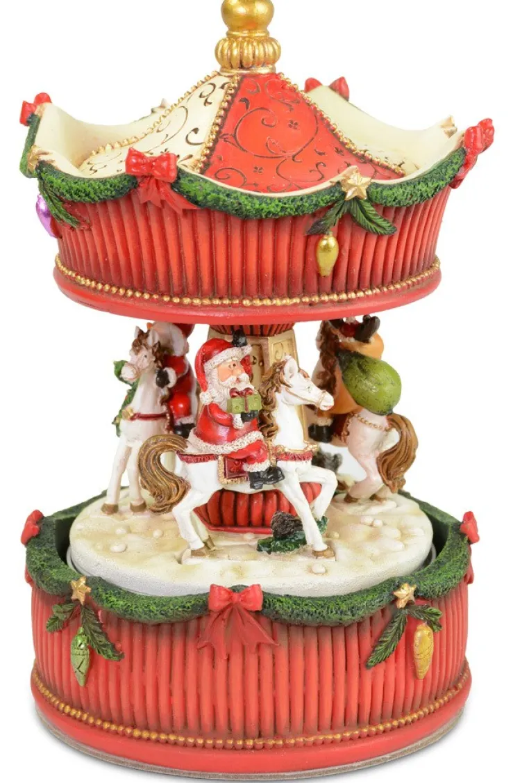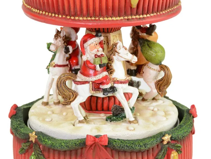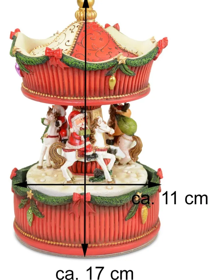 Mit dieser wunderschönen Spieluhr holen Sie sich ein kleines Stück Weihnachten direkt nach Hause. Die bezaubernde Karussell Spieluhr besitzt einen weihnachtlich dekorierten Sockel mit Tannenbaumgirlande, Tannenzapfen, Sternen und roten Schleifen. Das Nostalgie Karussell ist mit 3 weißen Pferdchen und reitenden Weihnachtsmännern oder Nikoläusen gestaltet. Auch das Dach ist mit Schleifen, Tannengirlanden und Sternen verziert. Sobald Sie die Uhr aufgezogen haben, dreht sich das Karussell und eine Melodie beginnt zu spielen.