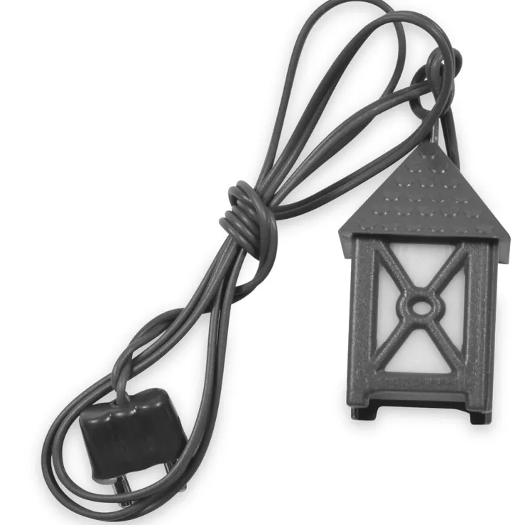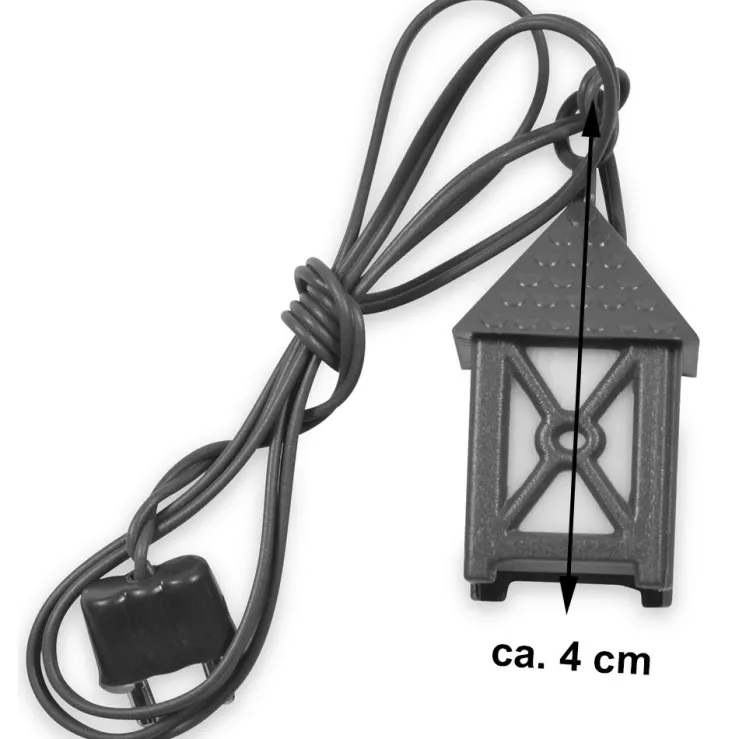 Mit dieser kleinen Laterne zaubern Sie ein romantisches Licht in Warmweiß. Die Kunststofflaterne ist mit einem kleinen Lämpchen ausgestattet und besitzt einen E5 Anschluss mit 4,5 Volt. Dadurch ist sie ideal für Weihnachtskrippen, Modelleisenbahnen oder Puppenstuben. Da die Laterne nach unten hin geöffnet ist, ist sie nur als Innendekoration für trockene Räume geeignet.