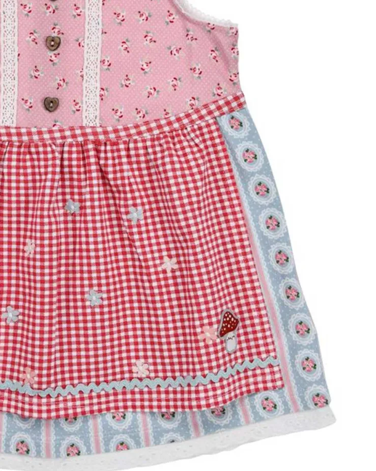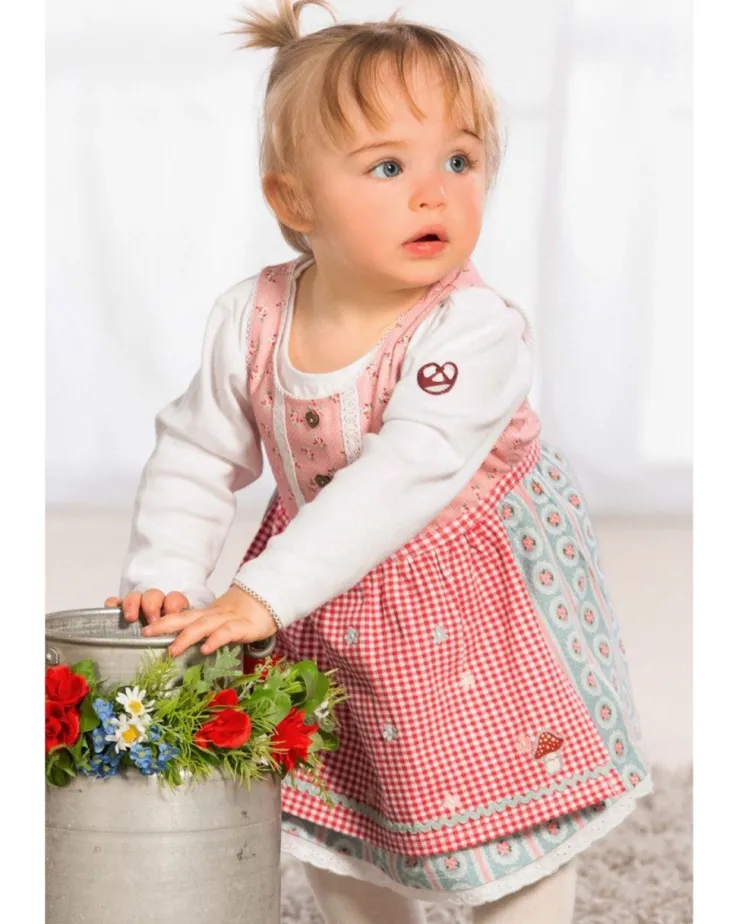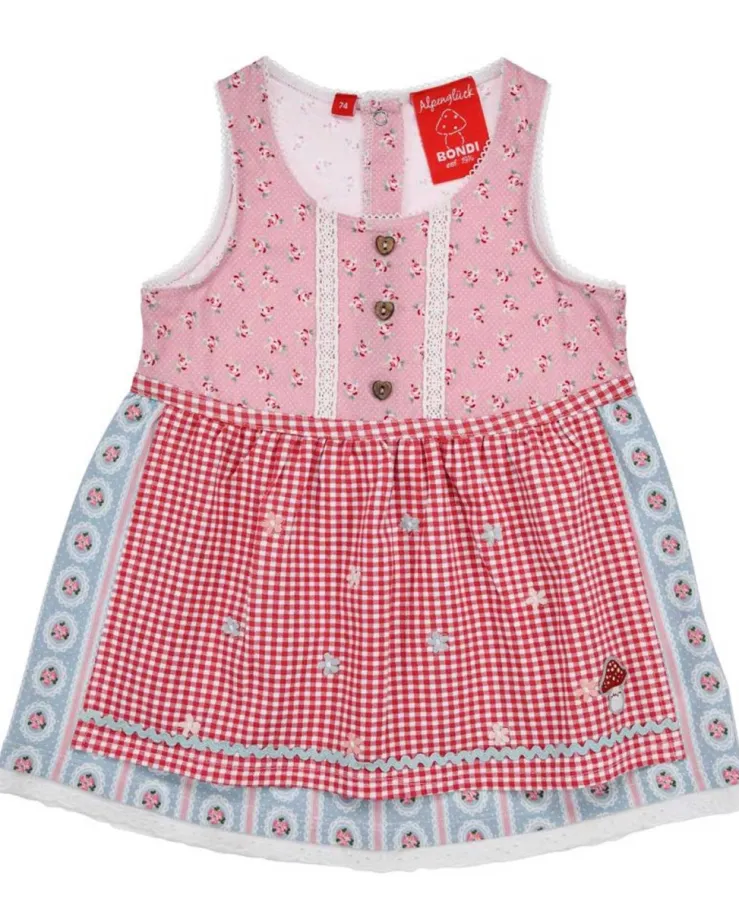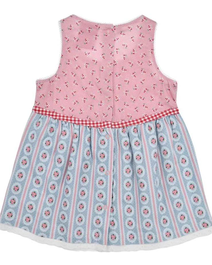 Entdecken Sie das zauberhafte Baby Mädchen Dirndl von BONDI Kidswear – ein Traum in Rosa und Hellblau. Das Oberteil ist mit einem zauberhaften Röschen Muster auf rosa Stoff designt, während der Rock in Hellblau gehalten ist und ebenfalls ein florales Muster hat. Die rot weiß karierte Schürze verleiht dem Kinderkleid einen trachtigen Charakter und die weiße Borte und die Herzknöpfe runden das ärmellose Trachtenkleid perfekt ab. Geschlossen wird das Dirndl auf der Rückseite mit Druckknöpfen, wodurch das An- und Ausziehen zum Kinderspiel wird. Mit diesem Trachtenkleid wird Ihre kleine Prinzessin zum Hingucker zu Oktoberfest, Kirchweih und andere festliche Anlässe.