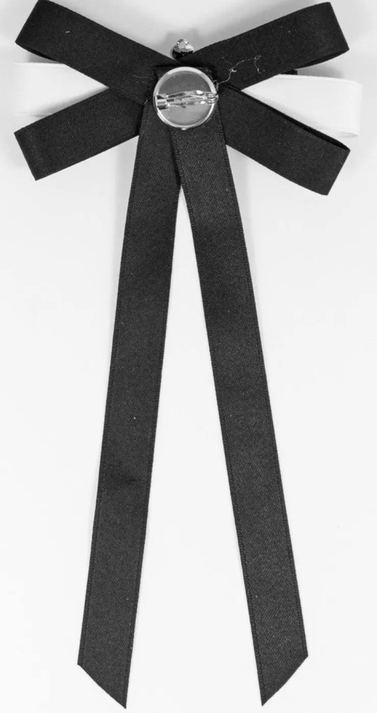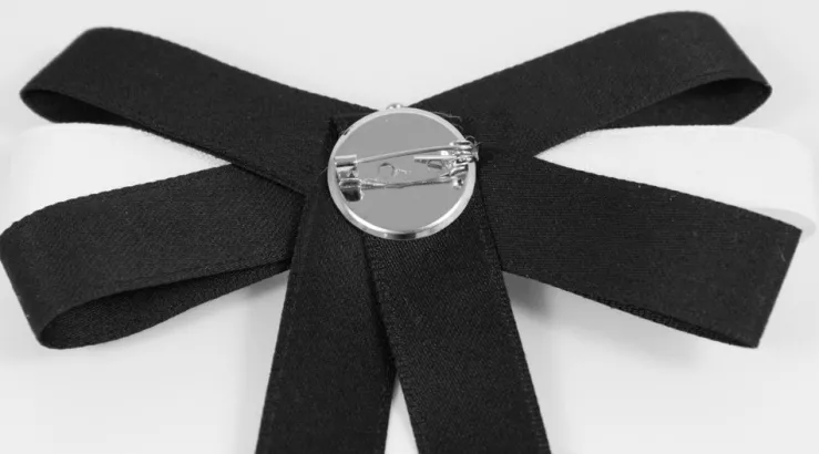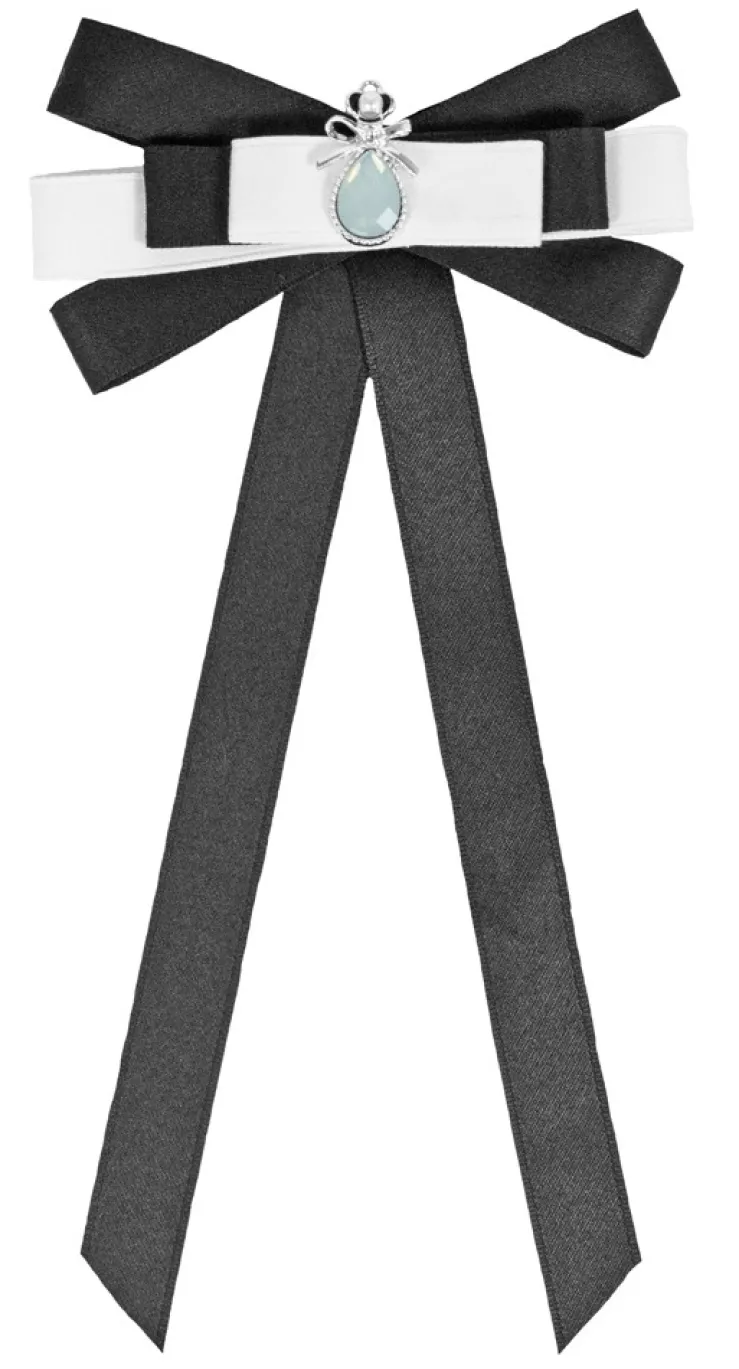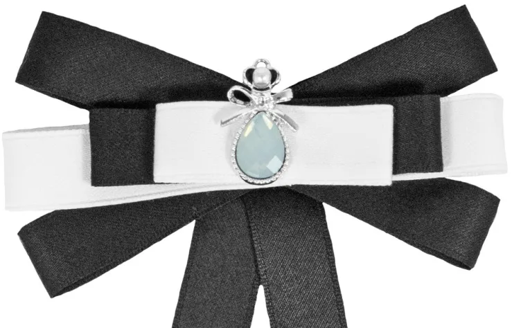 Die Schleife der Brosche ist in Schwarz Weiß gehalten und damit farblich zu allem kombinierbar und zeitlos elegant. Verziert ist sie mit einem süßen Krönchen, sowie einem weißen Stein oben in der Mitte der Mehrfach Schleife. Dadurch erinnert die Brosche mit der Barock Schleife an die früheren prunkvollen Barock Zeiten. Damit setzten Sie Ihrem Outfit die Krone auf.