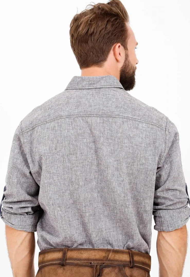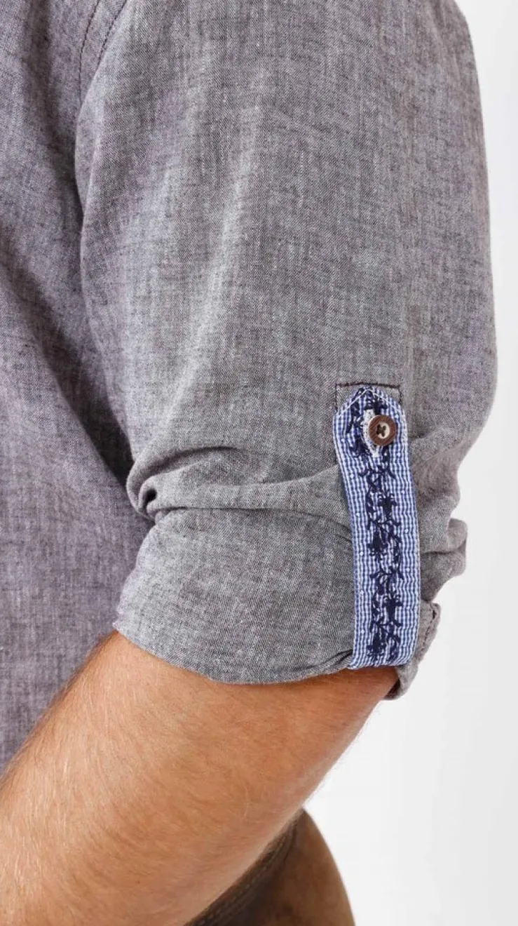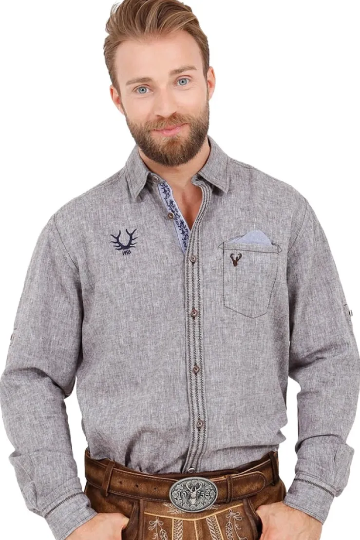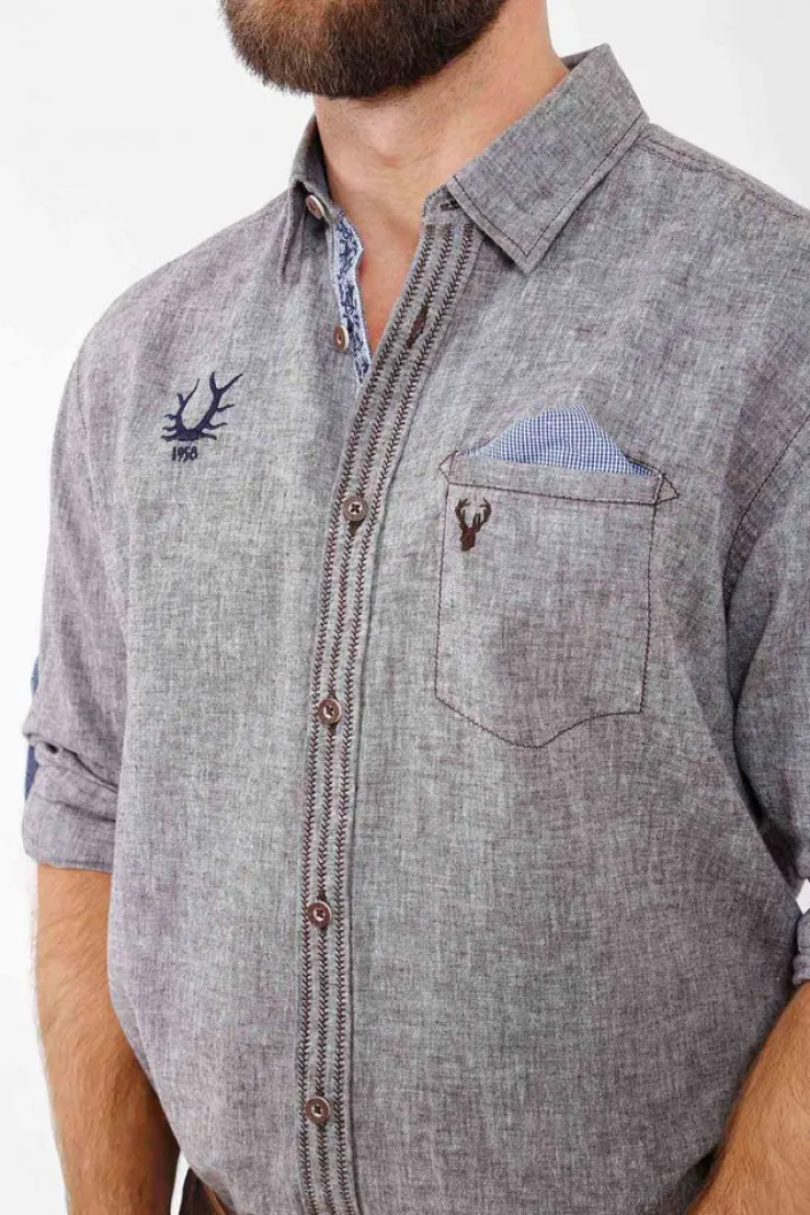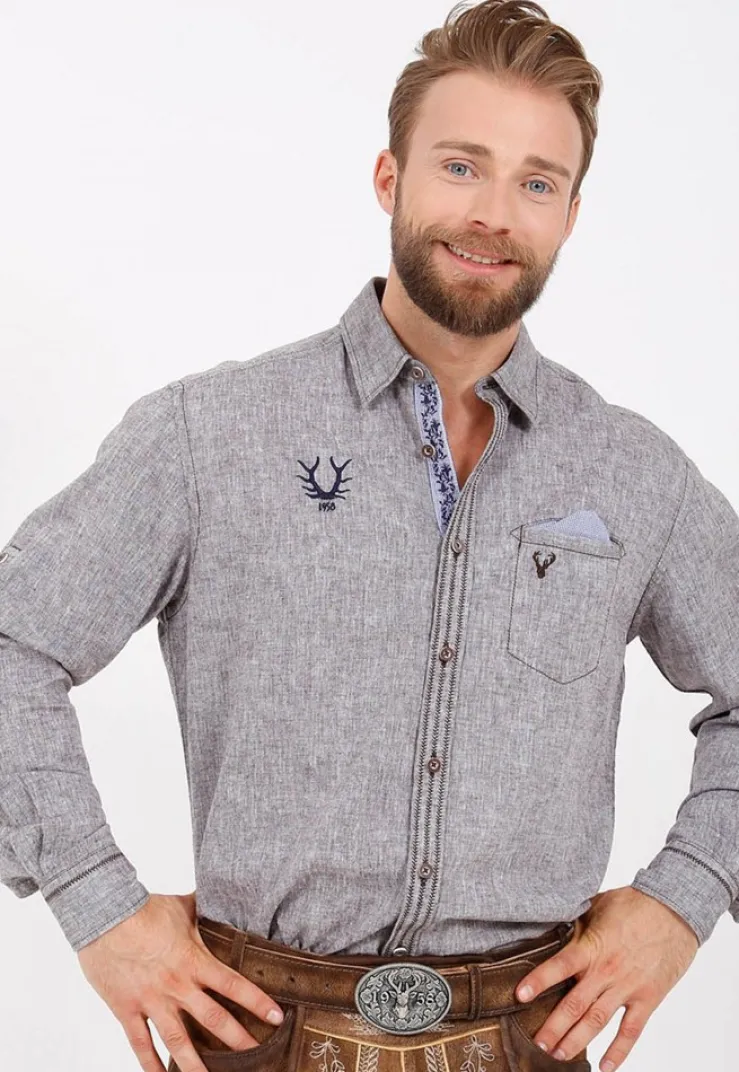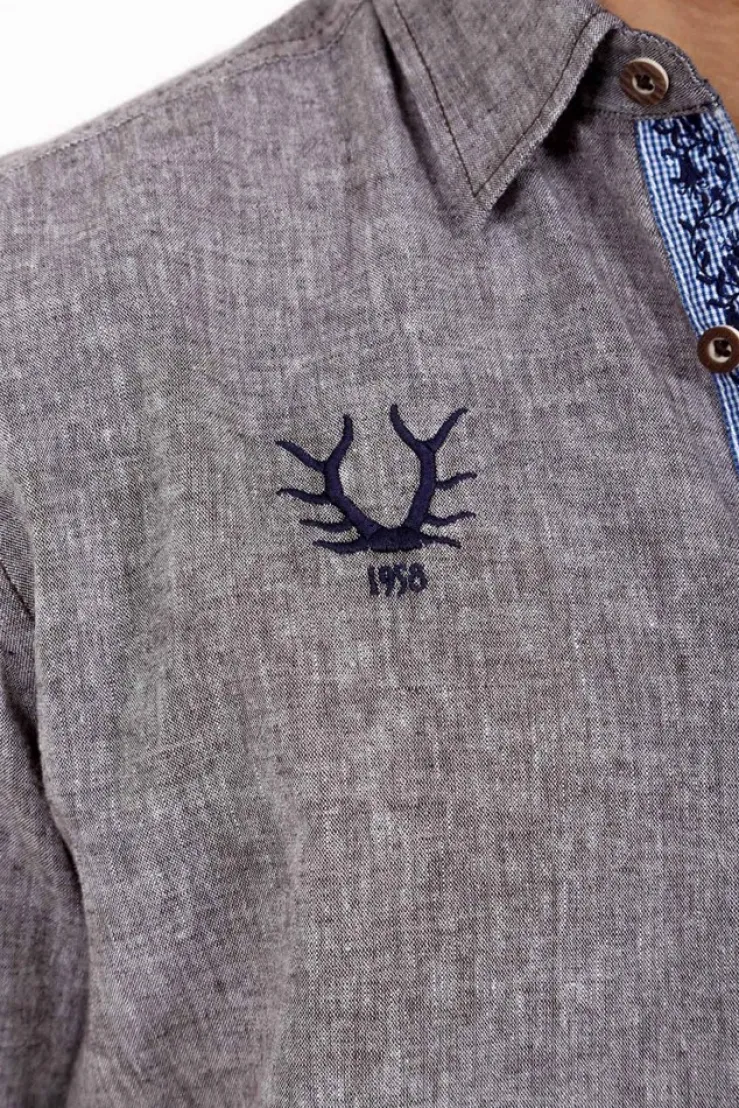 Das lässige, moderne Hemd wirkt wie aus grau braunem Leinen und hat verschiedene Hirschgeweih Stickereien. Die langen Ärmel sind krempelbar und lassen sich mit Riegeln nach oben knöpfen. Sowohl die Riegel, als auch die innere Knopfleiste sind feinkariert und mit floralen Ranken verziert. Ein toller, geschmackvoller Hingucker!