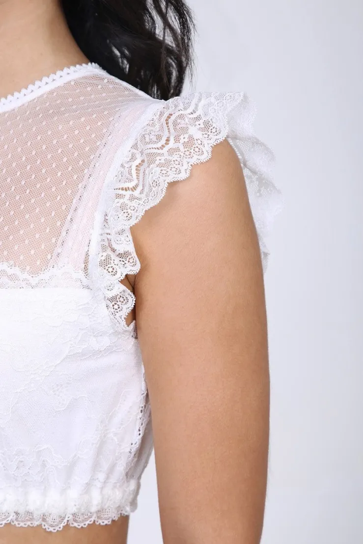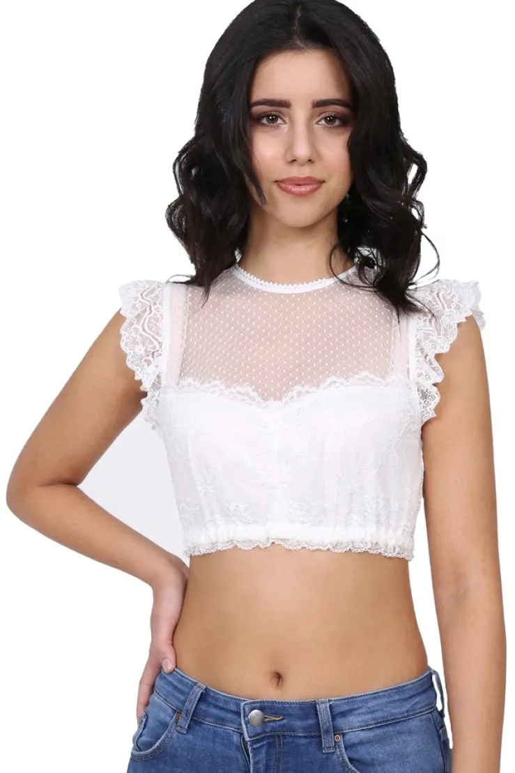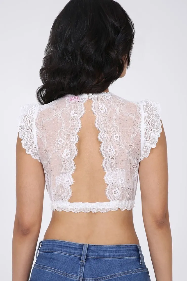 Die zauberhafte Kurzarmbluse ist aus einem angenehm zu tragenden Material hergestellt. Schöne Spitze auf den Flügel-Ärmelchen und dem Dekolleté und ein ganz besonderer Rückenausschnitt machen die Damenbluse zu einem tollen Hingucker. Der transparente Stoff am Dekolleté gewährt schöne Einblicke. Der eingearbeitete Gummizug am Blusenabschluss verleiht der Trachtenbluse einen perfekten Sitz und eine gute Passform.