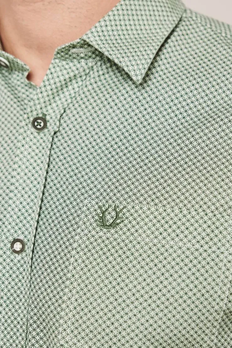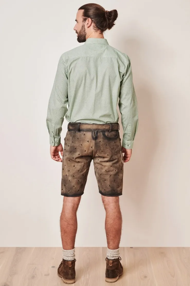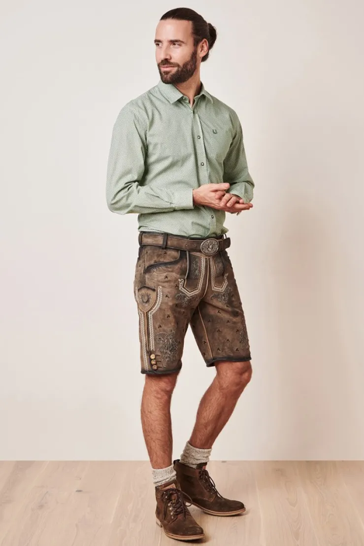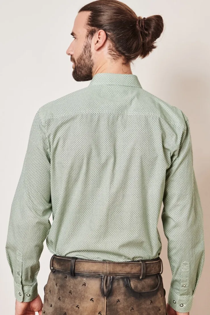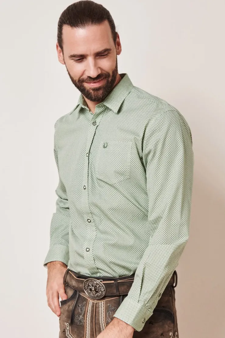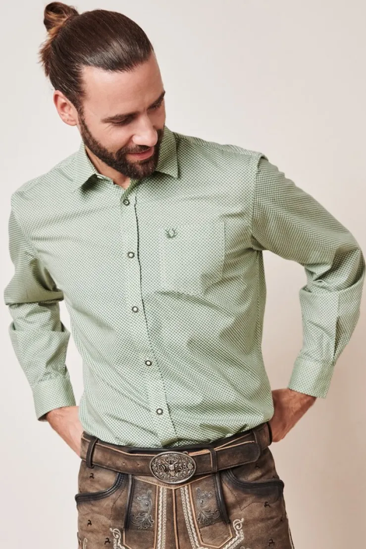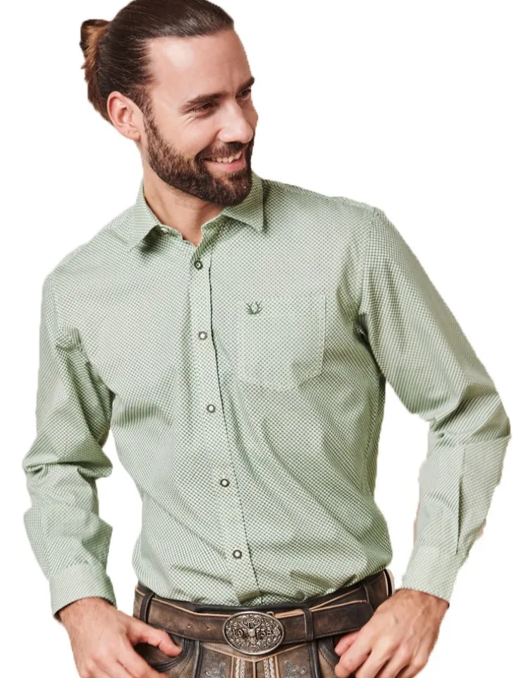 Diese schöne Herren Oberhemd vom deutschen Hersteller Krüger ist ein traditioneller Begleiter zu Lederhose und Trachten und ergänzt perfekt Ihr Trachtenoutfit. Das Herrenhemd ist aus feiner Baumwolle hergestellt und hat ein modernes, dezentes Muster. Es ist mit einem klassischen Kragen versehen und wird mit einer Knopfleiste mit Knöpfen in Hirschhornoptik geschlossen. Der Grünton wirkt erfrischend und passt prima zu vielen Lederhosen. Wer moderne Tradition und Hochwertigkeit schätzt, für den dürfte dieses Trachtenhemd genau das Richtige sein.