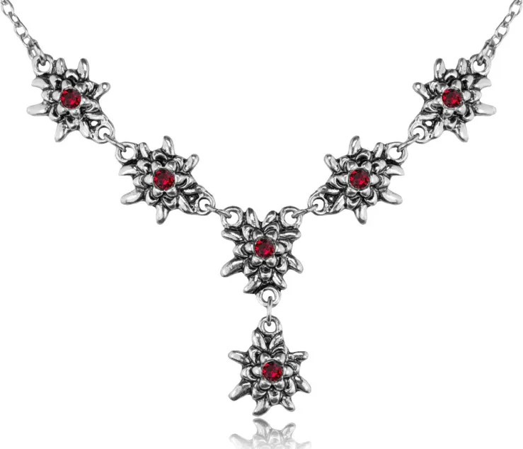 Dieses Strass Collier möchte man am liebsten gleich in allen Farben haben. Das Collier ist mit filigran gearbeiteten Edelweiß-Blüten versehen. Je ein glitzernder Swarovski Strass-Stein ziert die einzelne Blüte. Durch die klaren, frischen Farben ist dieser Halsschmuck ein echter Hingucker.