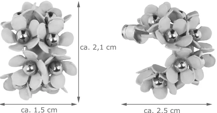Die Ohrstecker sind aus einer mit 16 Karat vergoldeten Eisenlegierung und als halboffene Creole gearbeitet. Besetzt ist der Ohrring mit kleinen, duftig wirkende Blümchen, die an Vergissmeinnicht erinnern. Die Blütenblätter der bezaubernden Blumen sind je nach Farbe in matt gehalten oder mit einem metallischen Glanz versehen. Die kleinen, goldenen Perlen im inneren der Blumen runden das Gesamtbild perfekt ab. Geschlossen werden die Damenohrringe mit einer Ohrsteckerpoussette.
