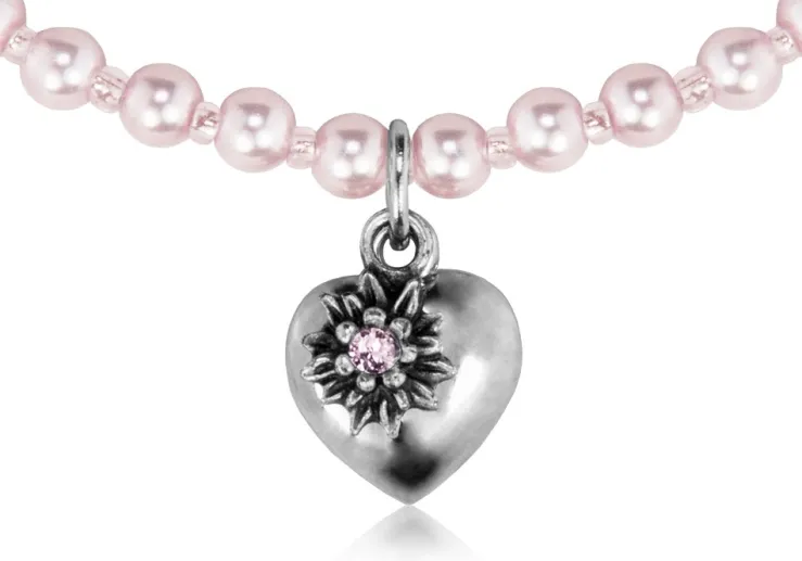 Die Halskette ist aus kleinen, zarten Perlen gefertigt, die in einem sanften Glanz erstrahlen und einen Hauch von Eleganz versprühen. Die Perlen sind perfekt aufeinander abgestimmt, wodurch die Kette einen edlen und doch verspielten Charme ausstrahlt. Die silbernen Anhänger – ein filigranes Herz und das klassische Edelweiß – verleihen der Kette einen trachtigen, traditionellen Stil, der gleichzeitig modern und zeitlos wirkt. Diese Kombination aus klassischen Symbolen und dem zarten Design macht die Kette zu einem einzigartigen Accessoire, das sowohl zu festlichen als auch zu alltäglichen Outfits hervorragend passt. Egal ob zu einem Dirndl und Trachten, einem sommerlichen Kleid oder sogar zu einer legeren Jeans – diese Halskette rundet jedes Outfit auf ganz besondere Weise ab und wird garantiert zum Blickfang.