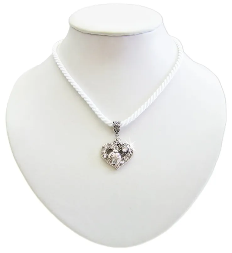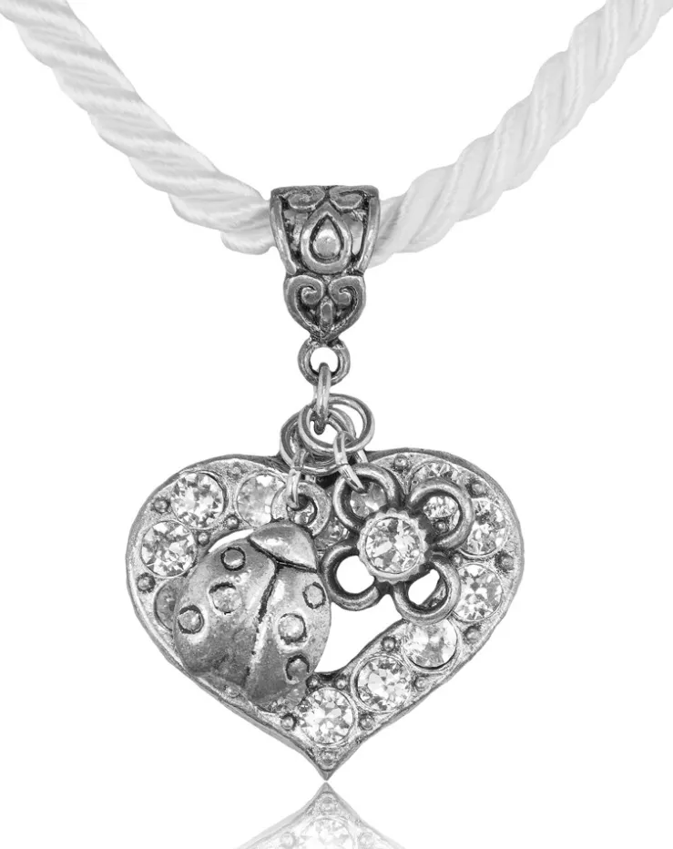 Der Rand Herz Anhängers ist mit vielen kleinen, farblich zum Kordelband abgestimmten, Strass Steinchen besetzt. Ein kleines, vierblättriges Blümchen mit einem Strass Element und ein süßes Glückskäferchen ergänzen den Anhänger und lassen ihn zum Blickfang werden.