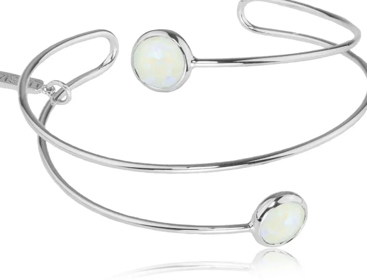Der Damenschmuck ist mit zwei 9 mm großen Kristallen von Swarovski® verziert, läuft spiralförmig und kann leicht gebogen werden, wodurch er sich jedem Handgelenk anpasst.