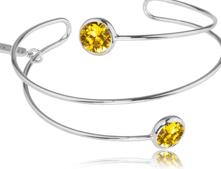 Der Damenschmuck ist mit zwei 9 mm großen Kristallen von Swarovski® verziert, läuft spiralförmig und kann leicht gebogen werden, wodurch er sich jedem Handgelenk anpasst.