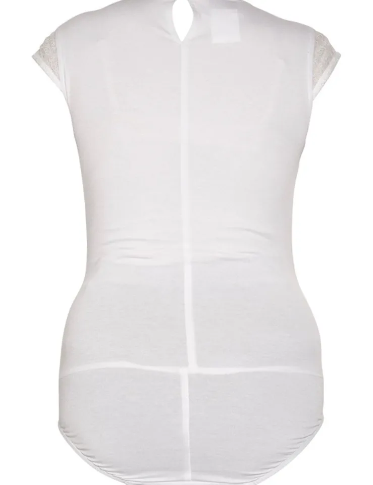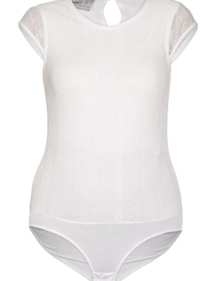 Ärmelloser Trachtenbody mit vertikalem Muster. Der eng anliegende Trachtenbody Fanessa-Emely mit kurzem, angeschnittenen Arm ist in elegantem Weiß gehalten und zeigt im Vorderbereich ein blickdichtes, weißes Streifendesign. Im Schulterbereich ist das Damenoberteil leicht überschnitten und mit transparenter Spitze verziert. Das Rückenteil ist schlicht gehalten, und mit einem kleinen Knopf sowie einer tropfenförmigen Öffnung im Nacken versehen. Als Futter dient ein angenehmes, blickdichtes Shirtmaterial, das Höschenteil aus stretchigem Jersey verfügt im Schritt über einen Druckknopfverschluss.