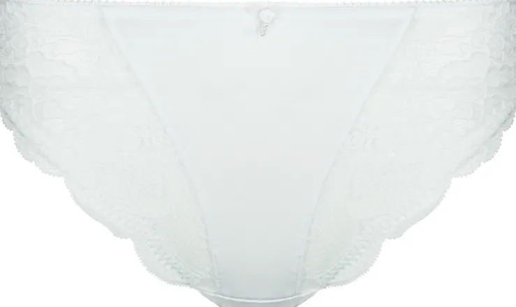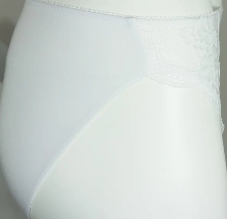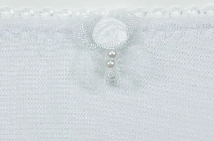 Die weiße Jazzpant ist zum Teil vorne und komplett hinten blickdicht gestaltet und an den Vorderseiten mit duftiger, floral dessinierter Stricktex-Spitze gearbeitet. Der Slip ist vorne mit einer kleinen Schleife, Blume und kleinen Perlen verziert. Die Unterwäsche ist pflegeleicht und formbeständig, auch nach vielen Wäschen.