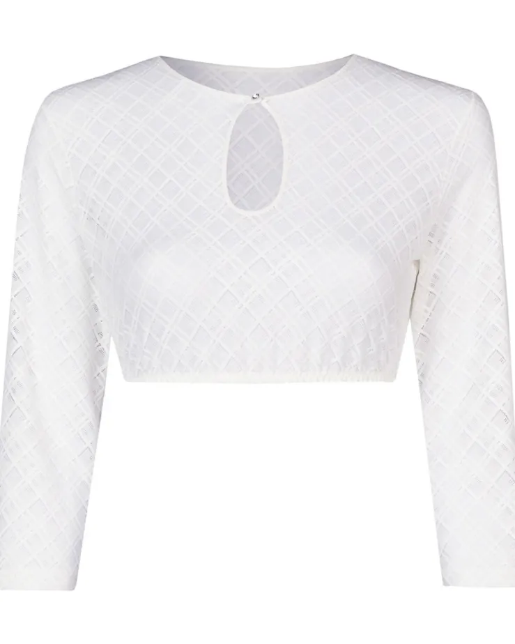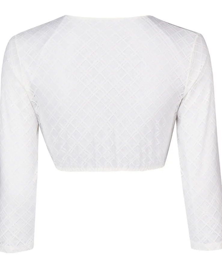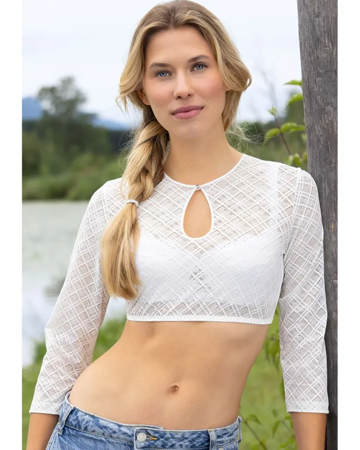 Unsere zauberhafte Dirndlbluse Naomi vom deutschen Markenhersteller Nina von C. lässt sich wunderbar zu Dirndl und Mieder kombinieren. Egal ob zu einem modernen, wie auch zu einem traditionellen Dirndl, diese Bluse begeistert durch ihre Vielseitigkeit, den Tragekomfort und die Qualität. Die Damenbluse ist aus schöner Spitze in modernem Karomuster hergestellt. Die Bluse hat einen Rundhalsausschnitt und besonders schön ist der Lochausschnitt und die dekorativen Saumabschlüsse. Der eingearbeitete Gummizug am Blusenabschluss verleiht der Spitzenbluse einen perfekten Sitz und eine gute Passform. Mit dieser Spitzendirndlbluse sind Sie beim Volksfest, Oktoberfest und zu festlichen Anlässen bestens gekleidet.