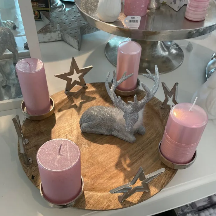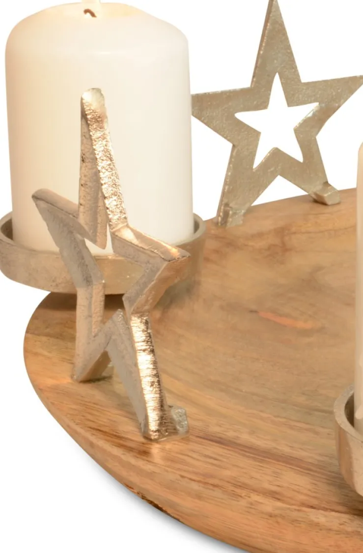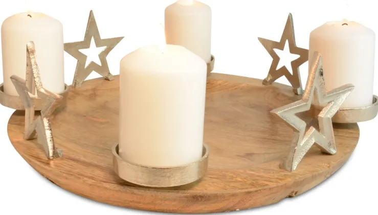 Mit diesem zauberhaften Kerzenhalter verbreiten Sie gleich ein gemütliches Weihnachtsfeeling. Der schöne Adventskerzenhalter besteht aus einem Teller aus Mangoholz mit 4 großen Metall-Sternen in Silber. Die schöne Stehdeko kann auch super als Adventskranz genutzt werden, da 4 Tüllen für Kerzen vorhanden sind. Der Teller der Weihnachtsdeko kann schön mit Glaskugeln uvm gestaltet werden.
