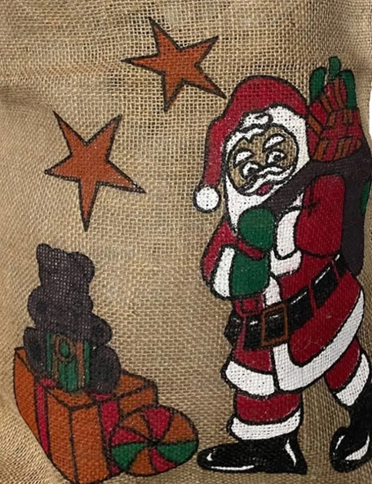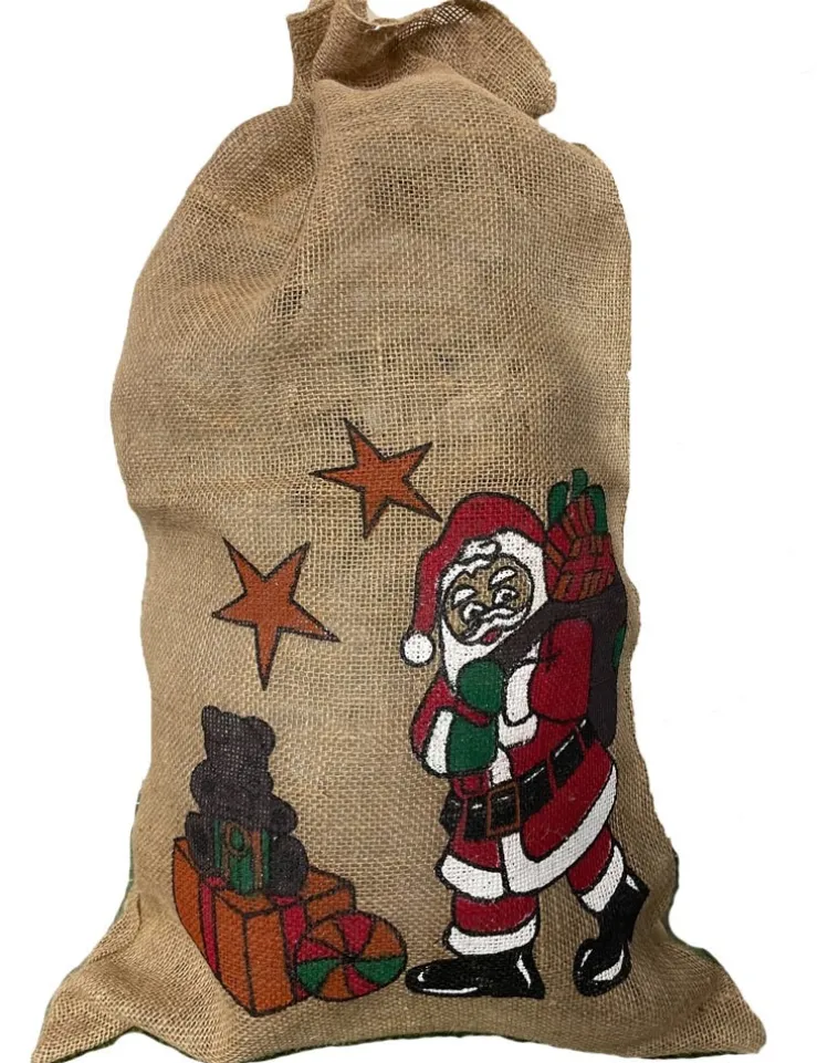 Mit diesem tollen Weihnachtssack macht es noch mehr Spaß Geschenke als Weihnachtsmann zu Weihnachten zu verteilen! Der Geschenkesack ist aus Jute hergestellt und wurde mit einem süßen Weihnachtsmann-Motiv verziert, der aus Nikolaus, Sternen, Geschenken, Teddybär und einem Ball besteht. Damit die Präsente auch gut verpackt sind, befindet sich an der Öffnung des Beutels ein Band zum Schnüren.