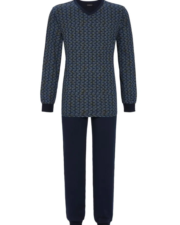 Modern Style – Mit diesem Pyjama aus reiner Baumwolle steht einer angenehmen Nachtruhe nichts mehr im Wege. Das gemusterte Dessin dieses Modells unterstreicht den stilvollen Charakter dieses Herren-Pyjamas. Der V-Ausschnitt und die Strickbündchen an Ärmeln und Beinen unterstreichen den Tragekomfort. Perfekt dazu abgestimmt ist die unifarbige Hose mit bequemem Gummizugbund. Das Material liegt weich auf der Haut und überzeugt durch Pflegeleichtigkeit. Baumwolle ist eine sehr hautfreundliche Naturfaser, die aus den Samenhaaren der Baumwollpflanze gewonnen wird. Baumwolle ist atmungsaktiv, sehr saugfähig, strapazierfähig und reißfest.