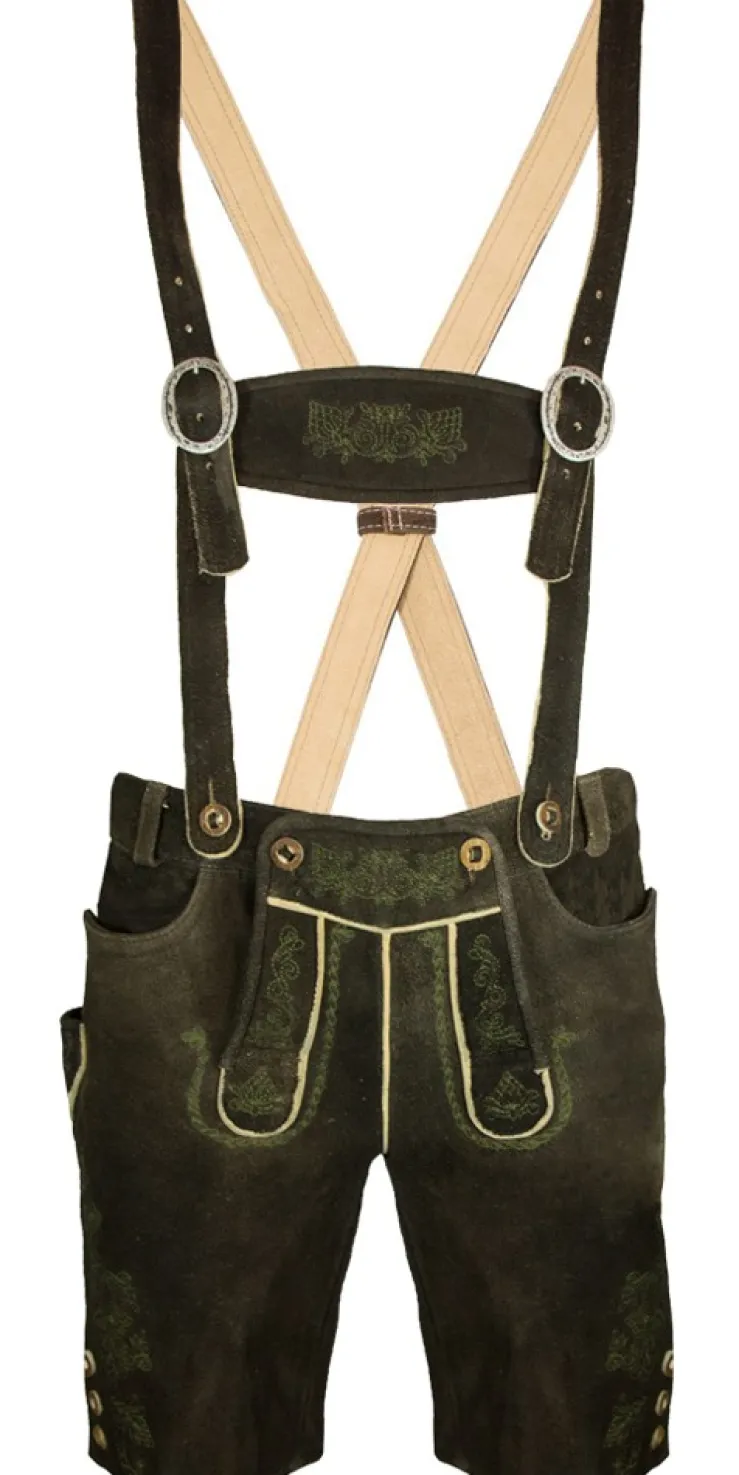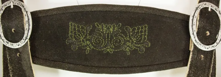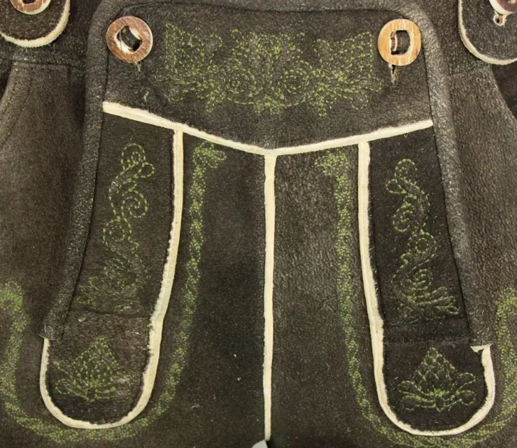 Die dunkelbraune kurze Lederhose aus Hirschleder ist besonders hochwertig verarbeitet und sehr weich im Griff. Schöne grüne Stickereien seitlich am Bein, am Hosenlatz und am Brustteil des H-Trägers machen diese Hose zu einem echten Hingucker. Der Hosenlatz wird vorn durch Hirschhorn Knöpfe geschlossen, auch die Träger sind mit Knöpfen befestigt. Die Bundweite kann hinten durch ein Lederband reguliert werden. Die Lederhose hat vorne zwei Hosentaschen und ist zusätzlich noch mit einer Hosentasche hinten und einer kleinen Seitentasche versehen. Die abnehmbaren Stegträger sind variabel einstellbar und machen diese Hose zu einem zünftigen Begleiter für jeden Trachtenliebhaber.