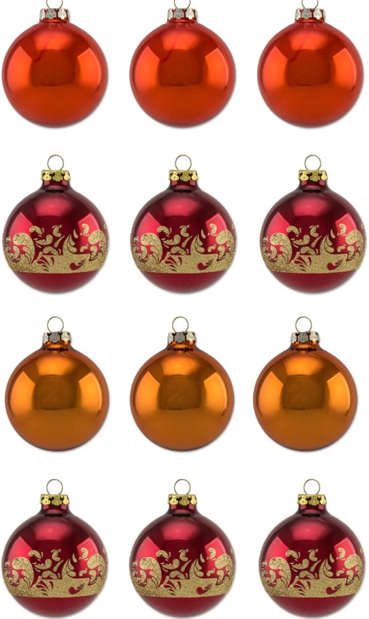 Und mit diesem schönen 12-teiligen Set von Thüringer Glasdesign wird Ihr Nadelbaum, egal ob echt oder künstlich, zu einem der schönsten geschmückten Weihnachtsbäume an Heiligabend werden. Das mehrteilige Glaskugel-Set besteht aus 8 cm großen Kugeln, einmal je 3 Stück in glänzendem Rot und Orange und einmal 6 Stück in dunkelrot mit wunderschönem Glitzer Dekor in Form von Wellen. Die Weihnachtskugeln werden mit Metallaufhänger sicher verpackt geliefert.